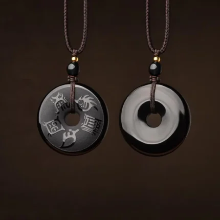 The Tibetan Obsidian Protection Necklace features a round ring shape and is made with high-quality obsidian materials, including gold sheen obsidian, rainbow obsidian, and black obsidian. This necklace