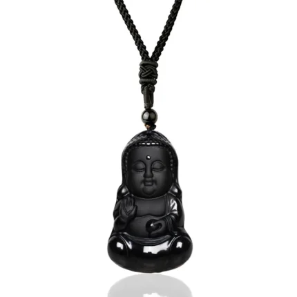 Natural Black Obsidian Crystal Buddha Strength Protection Amulet Lucky Charm Pendant Necklace is a necklace made with a black obsidian crystal pendant carved