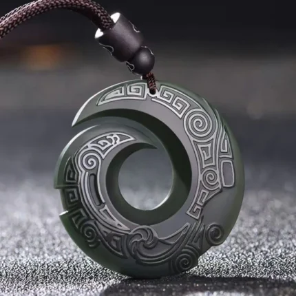 Our Hetian Cyan Jade necklace features a peace buckle symbolizing harmony and generosity, and a unique design pattern based on the Chinese idiom "One's Luck Improves".