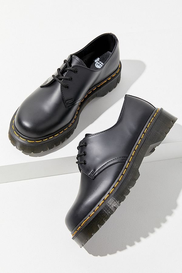 Bring subculture style to new heights in this extra-chunky oxford from Dr. Martens. 3-eye lace-up shoe in a classic smooth leather with a semi-bright finish. Sits atop the Doc’s signature AirWair sole – oil + fat resistant for ultimate abrasion. Finished with iconic yellow sewing around the stacked rubber midsole and constructed with a Goodyear-welted stitch that lasts a lifetime.