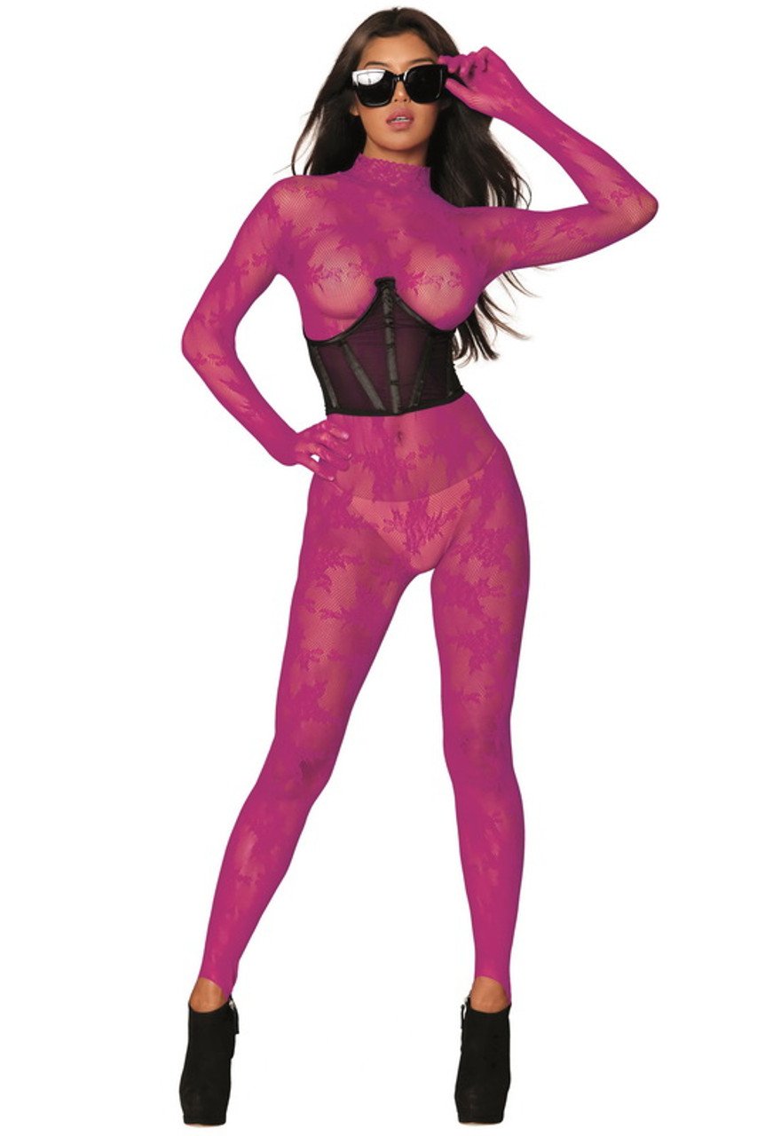 Seamless floral knitted fishnet catsuit bodystocking with long sleeves with built in gloves with fingers, stretch lace mock turtleneck with snap closure, open back detail and stirrup style foot opening. G-string and underbust corset not included.