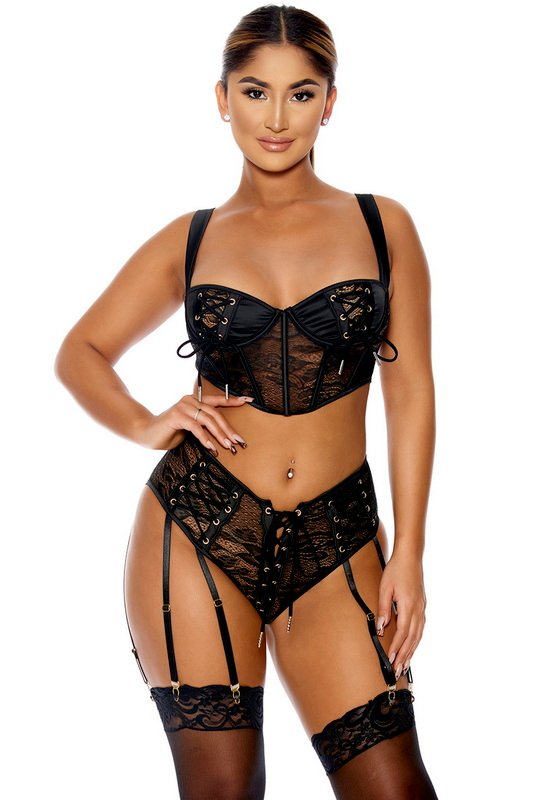 Stretch satin and floral lace corsetry inspired set features underwire cup bustier with adjustable shoulder straps and boning along with lace-up grommet detail and matching panty with garter straps. Stockings sold separately. WARNING: In accordance with CA Prop 65, this product may expose you to chemicals which are known to the State of California to cause cancer or reproductive harm.