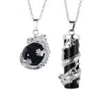 The stunning Buddha Stones Dragon Wrapped Round Ball Gemstone Couple Necklace Pendant set. This 2pc Dragon Couple Necklace Pendant set features beautifully crafted black onyx gemstone pendants, wrapped with dragon designs, on a round ball necklace chain. Perfect for couples who want to show their love and style with matching jewelry.