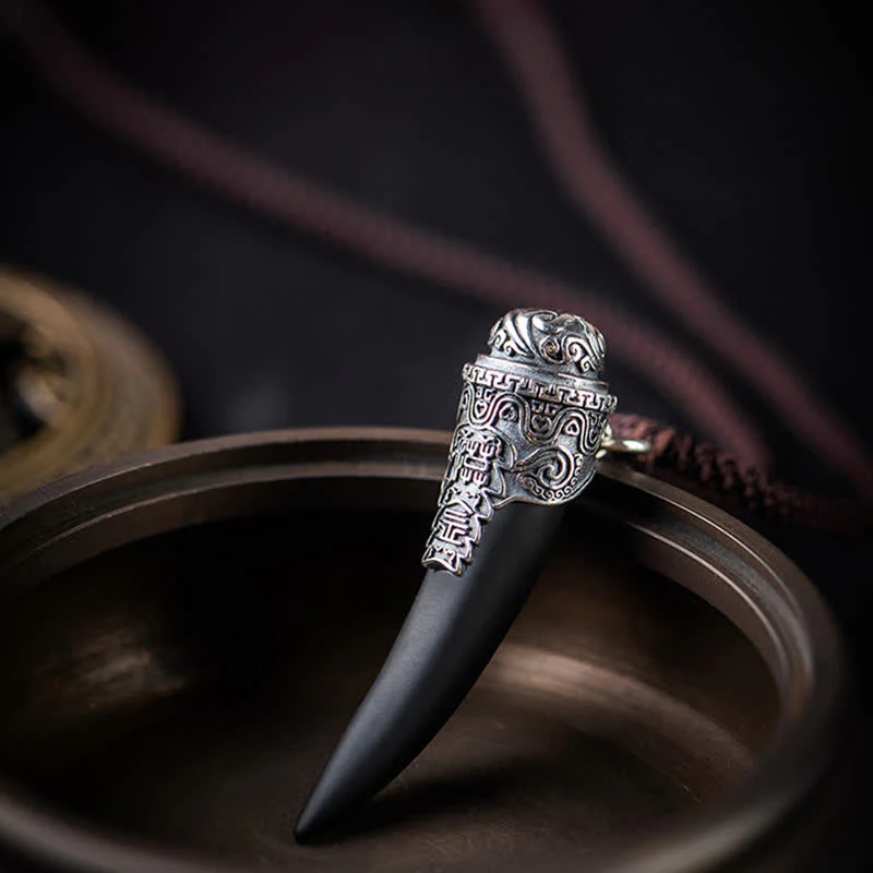 Buddha Stones 925 Sterling Silver Black Obsidian Wolf Tooth Pattern Strength Necklace Pendant