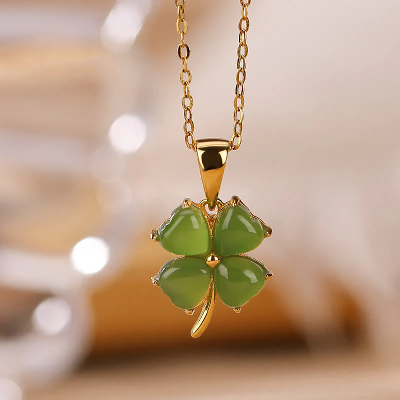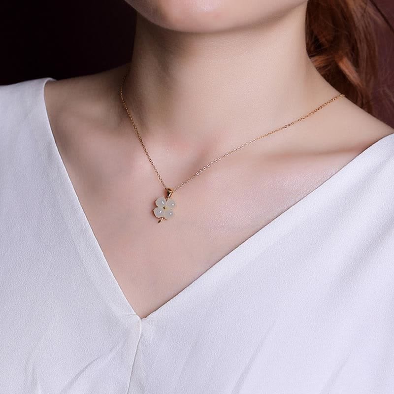 Buddha Stones 925 Sterling Silver Hetian White Jade Cyan Jade Luck Four Leaf Clover Happiness Necklace Pendant