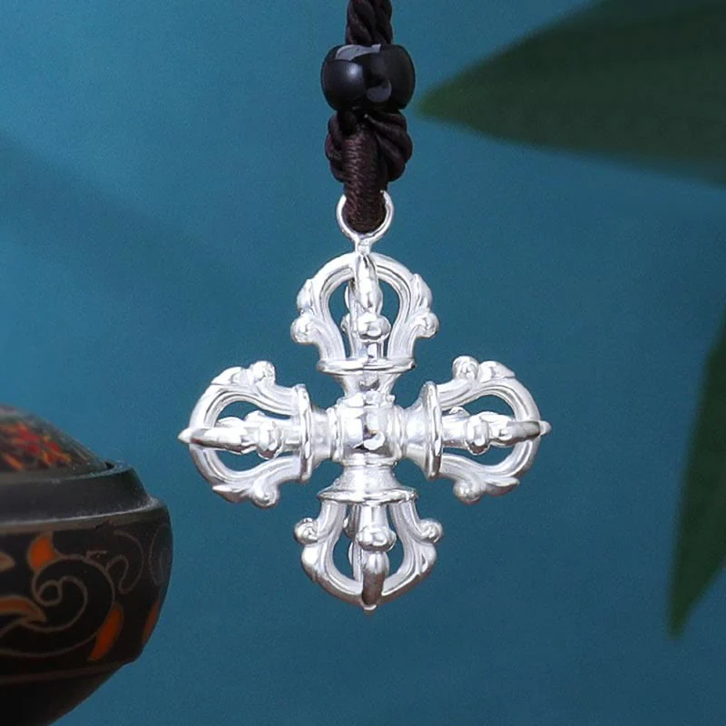 Buddha Stones 999 Sterling Silver Double Dorje Vajra Spiritual Power Strength Necklace Pendant