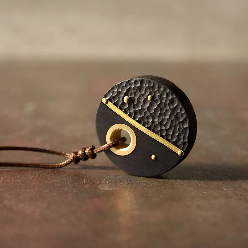 This handcrafted necklace, with a round ebony wood and copper pendant, is a masterpiece of skilled craftsmanship. Using high-quality materials, it symbolizes peace and positivity. Ideal for those seeking good luck and meaningful change, it's perfect for everyday wear or as a thoughtful gift.