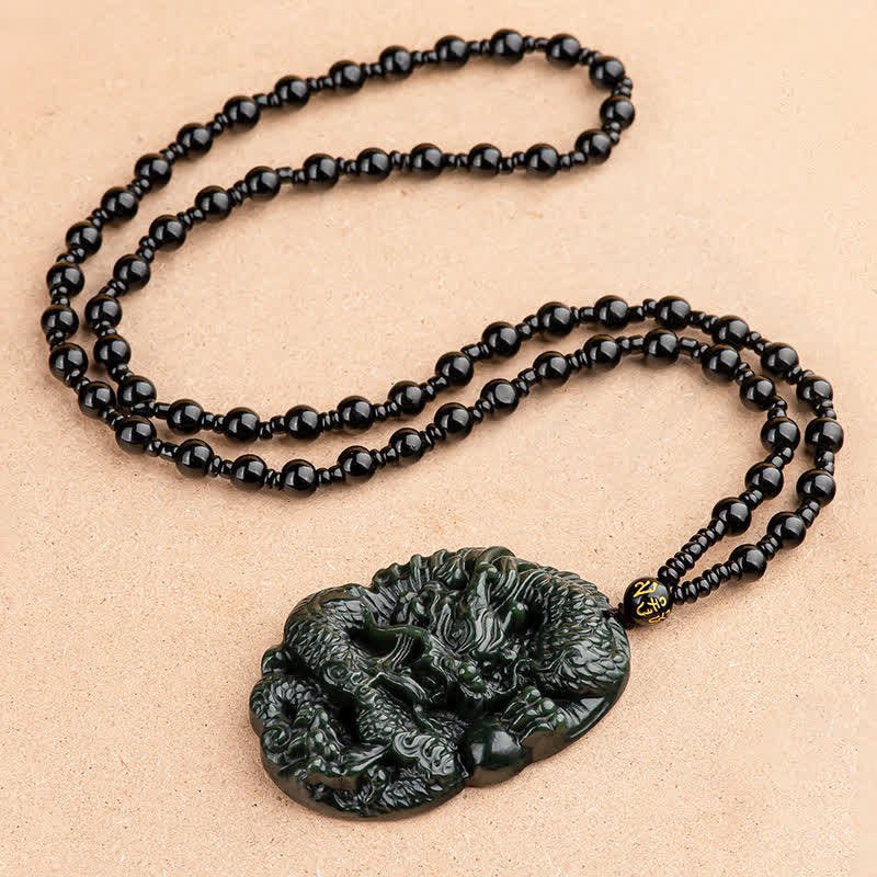 Buddha Stones Hetian Cyan Jade Dragon Success Harmony Necklace Beaded String Pendant
