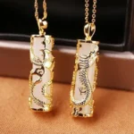 The Jade Dragon Phoenix Copper Blessing Harmony Necklace Pendant features a beautiful design of the dragon or phoenix, symbols of power and balance, on a green jade stone. The pendant is made of copper and is perfect for those who seek harmony and blessings in life.