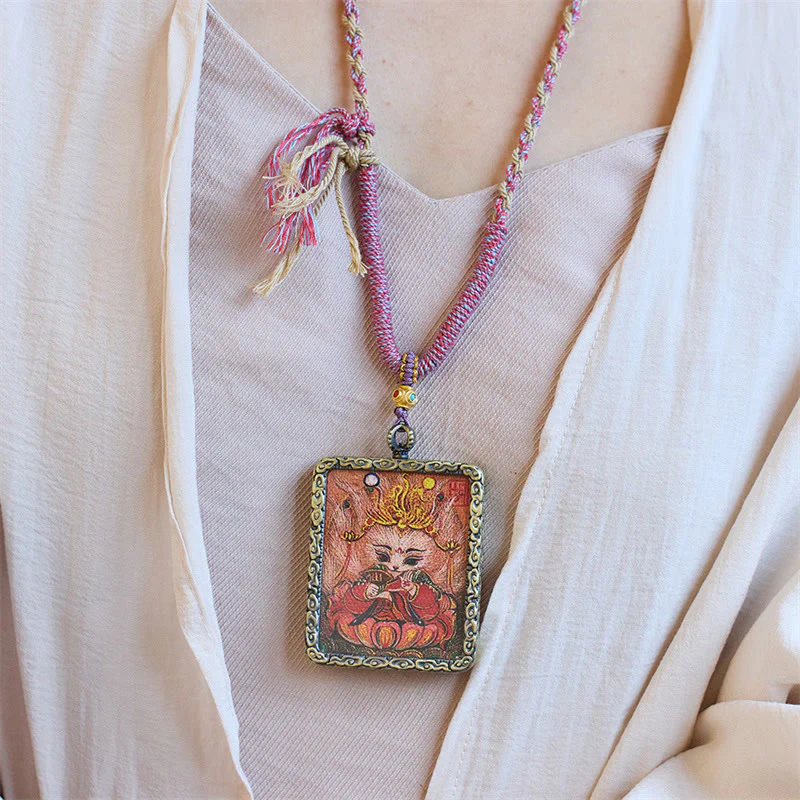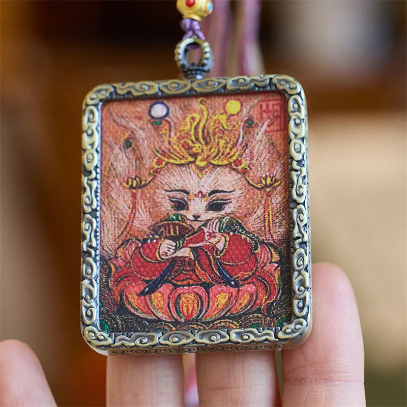 Buddha Stones Tibetan Hand-Painted Thangka Nine-Tailed Fox Luck Necklace Pendant