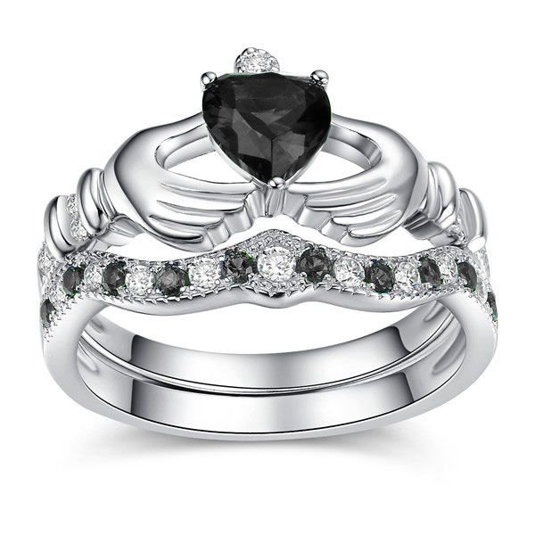 Celebrating love, beauty and Irish culture, this claddagh ring set will capture your heart at first sight. Crafted in sleek sterling silver, the ring features a black heart center stone set on a high polished shank. The traditional claddagh ring is a meaningful token of loyalty, friendship and love. The hands represent friendship, the heart represents love and the crown represents loyalty.With the beautiful coordinating band, the ring is a dazzling look of love.