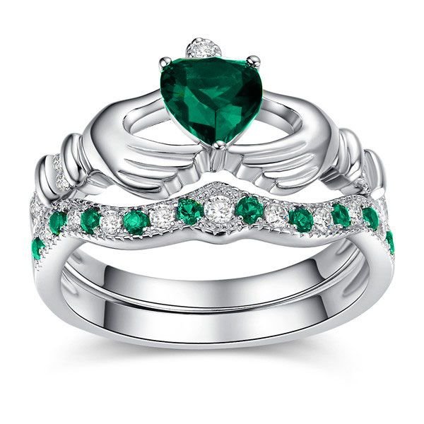 Celebrating love, beauty and loyalty, this claddagh ring speaks right to her heart. Fashioned in sleek sterling silver, this traditional claddagh ring is centered with a green heart-shaped stone. A meaningful token, the hands represent friendship, the heart represents love and the crown represents loyalty. On your wedding day, a coordinating shimmering band complements the meaningful design. This claddagh bridal set is certain to be treasured.