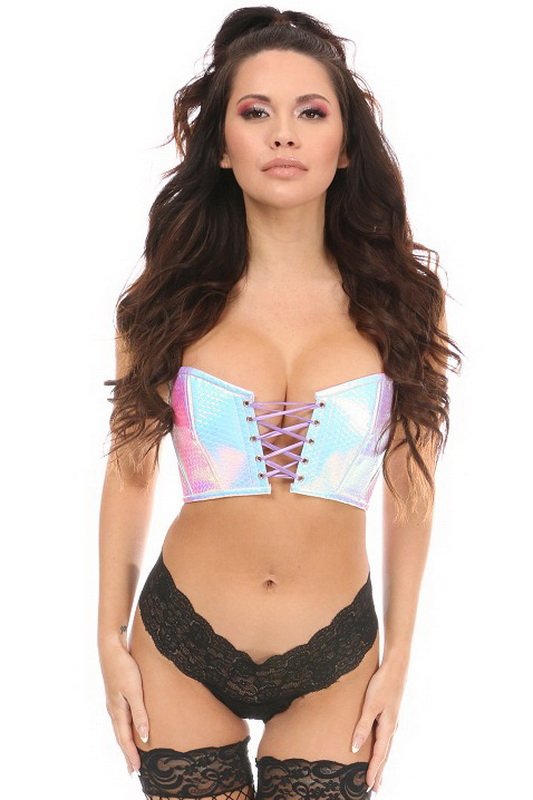 Short Bustier corset made of high quality mermaid holo fabric. Front lace-up detail. Back zipper closure. Removable and adjustable straps. Nickel brass grommets with polyester laces at back. Satin ribbon lacing in the back. Hand Wash Only
