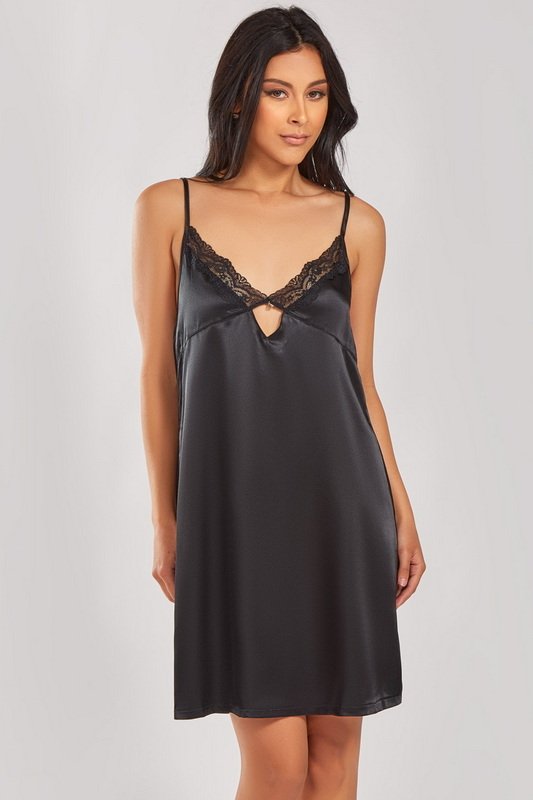 Satin chemise with lace trim cups, front keyhole cutout and spaghetti straps.