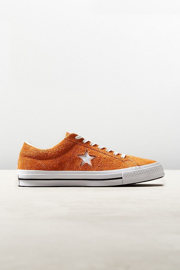 Iconic One Star sneaker from Converse. Low-top in a textured suede-like fabrication with perforated detailing + cutout star logo at sides. OrthoLite® midsole provides cushioning over a grippy, rubber sole.