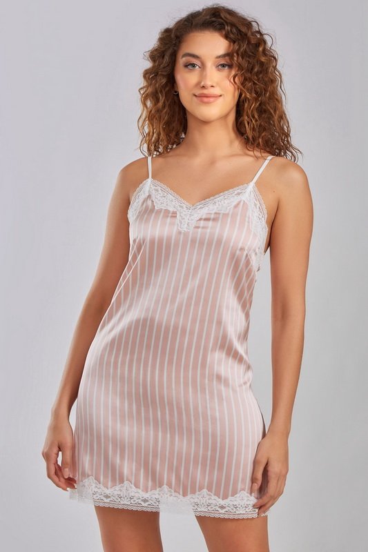 Get comfortable in this sweet and classic chemise. Made with a lovely pinstripe patterned fabric and featuring V neckline with lace applique trim, lace applique trim, and adjustable shoulder straps.