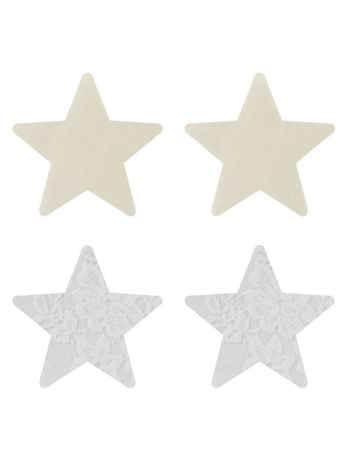 White Star Pasties-Two Pair Set: Includes two pairs of star-shaped self-adhesive pasties. One pair is solid white and the other white lace.